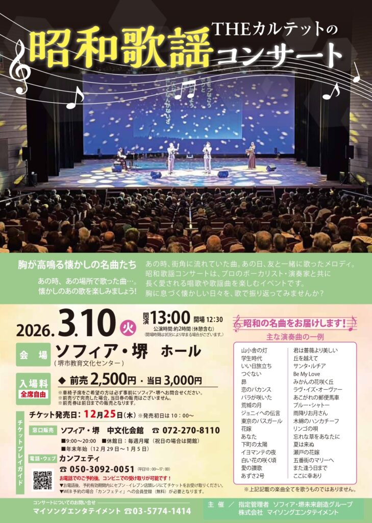 お知らせ 「THEカルテットの昭和歌謡コンサート」チケット情報 2026.03.05 3月10日(火)開催「THEカルテットの昭和歌謡コンサート」前売チケットの窓口販売は3月8日(日)20時までとなります! 当日は¥3,000で販売いたします 多数のご来館お待ちしております。 2026年度ソフィアカルチャー「現役プロに教わる!和太鼓教室」 前の記事 【関西初上映】 サカナクション グッドナイト・プラネタリウム 次の記事 新着のお知らせ 【関西初上映】 サカナクション グッドナイト・プラネタリウム 2026.03.05 2026年度ソフィアカルチャー「現役プロに教わる!和太鼓教室」 2026.03.03 ソフィア・堺 こども将棋教室体験会 2026.03.01