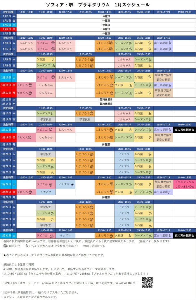 お知らせ , プラネタリウム 2026年1月のプラネタリウムの投影スケジュールと団体予約状況について 2025.12.20 プラネタリウムの2026年1月1日~1月31日の投影スケジュールと団体予約状況はこちらの画像をご覧ください。 【予約受付開始】スターリーテラーkeisukeのプラネタリウムで笑いまSHOW 前の記事 SOPHIA Times 冬号 次の記事 新着のお知らせ SOPHIA Times 冬号 2025.12.21 【予約受付開始】スターリーテラーkeisukeのプラネタリウムで笑いまSHOW 2025.12.20 令和8年1月のプラネタリウム団体予約の締め切りは12月23日(火)17時です 2025.12.16