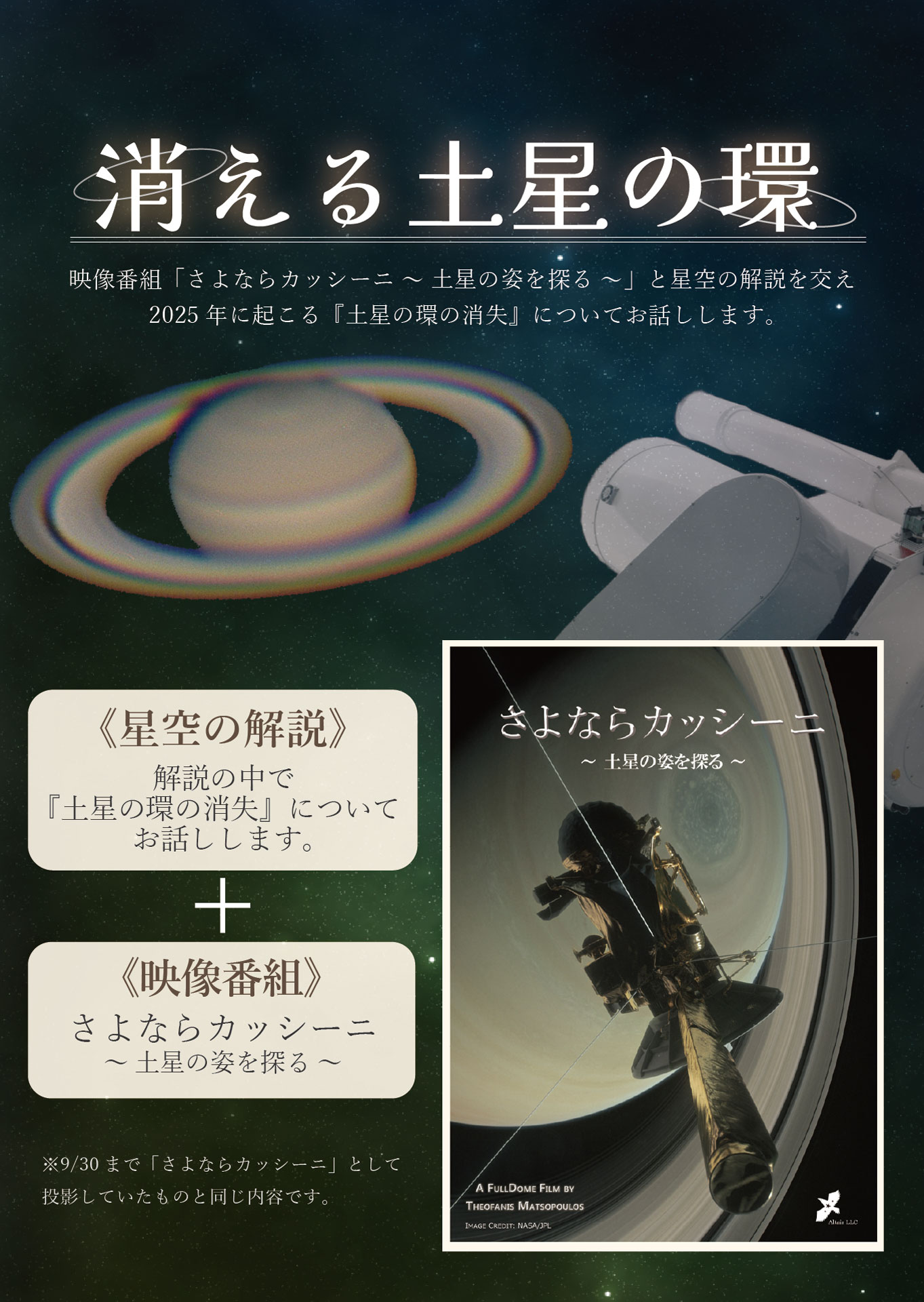 今年2025年は土星の環が見えなくなる天文現象、『土星の環の消失』が起こります。どうして環が消えてしまうのか星空の解説と映像番組「さよならカッシーニ ~ 土星の環を探る ~」を交え、土星の環の消失についてお話します。 《番組紹介》 「カッシーニ」は、NASAやESA(ヨーロッパ宇宙機関)などが中心となって行われた国際協力プロジェクトです。 土星にはこれまで1979年~1981年にかけて、パイオニア11号・ボイジャー1・2号が探査を行いましたが、 いずれも土星を通過しただけのわずかな期間の観測だったのです。 1997年に打ち上げられ、7年の月日を経て 2004年土星に到着・観測を開始しました。 カッシーニでは土星をまわる軌道に入り、予定の4年を遥かに超える13年もの長きにわたって土星の観測を 行い、新たな素晴らしい発見をしたのです。 この番組では、土星探査機カッシーニを通して、美しいリングを持つ土星の姿に迫ります